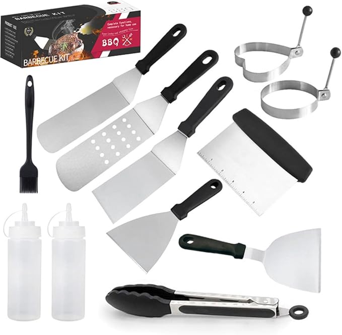 - 【Complete Practical Griddle Accessories】The premium grill tool set has all the griddle tools you need for backyard griddle cooking It comes with 2 spatulas, 1 burger spatula, 1turner,1 scraper, 1tongs, 2 egg rings, 2 bottles,1cleaning pads .With a compact storage bag which keep your tools neatly organized and better protection .It is not only convenient to carry, but also can be given to friends as a gift.