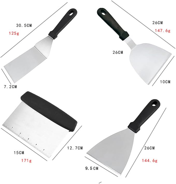- 【The Necessary Tools】These griddle utensils set will allow you complete all the griddle applications. Two griddle spatulas great for flipping burgers, pancakes, veggies, and more, one with holes help drain excess grease or oil off of cooked meat/ poultry when taking off of griddle. Spatulas and scrapers are both with cutting edge for dicing food and scrape griddles clean.It will please everyone at your BBQ, weekend party or your everyday meals.