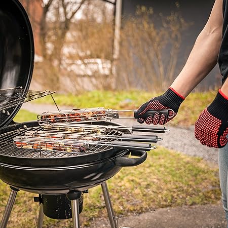 - ULTIMATE GRILL KIT – Includes a set of 4 large kabob grilling baskets for outdoor grilling, exclusive marinade brush and grill gloves.