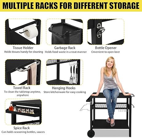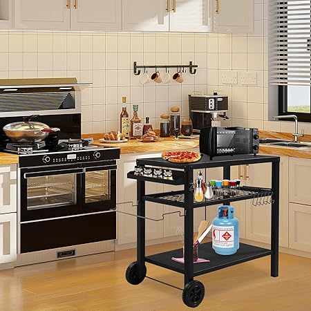 - Ample Storage Space: Three-tier design and its thoughtful layout provide ample space for storing a variety of items such as food, utensils, and grilling tools. It is designed to maximize your storage area while maintaining easy access to your cooking essentials.
