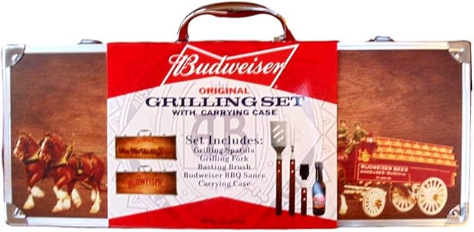 - VERY NICE DELUXE BBQ TOOLS SET – A great BBQ grilling set for those who love to enjoy grilling all year round. The Budweiser branded aluminum carrying case contains all the tools essential for an enjoyable grilling experience. Each case comes with Budweiser branded spatula, grilling fork, basting brush and a 5.5-ounce bottle of Budweiser BBQ sauce to ensure you capture the proper BBQ taste.