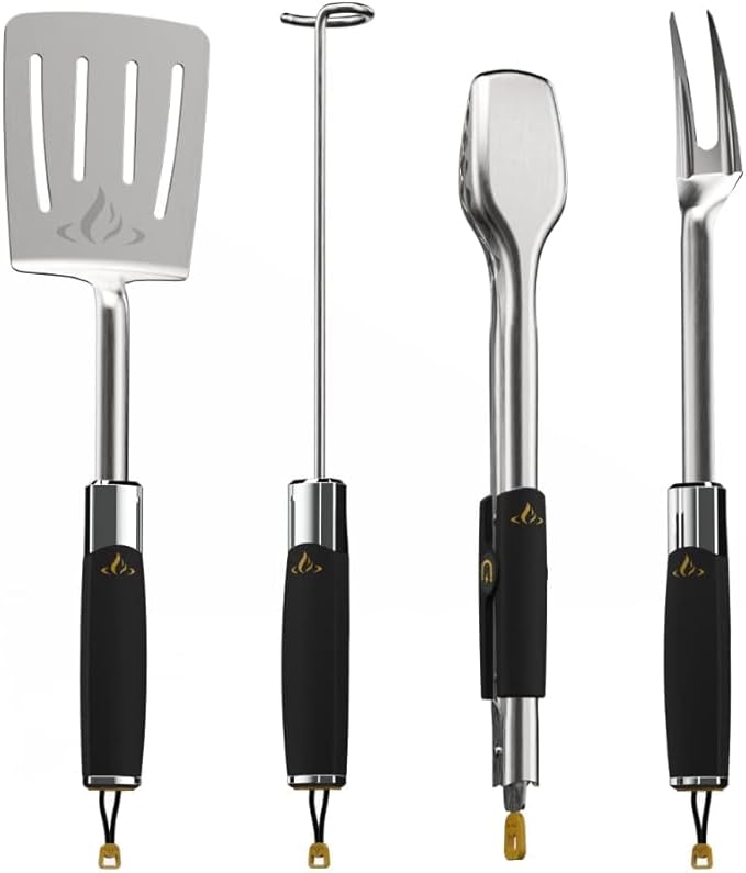This grill tool kit has all the essentials you need for any backyard griller. Well made and love the magnetic handle feature. Don’t use any of my other bbq tools now that I have these