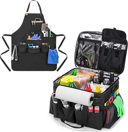Large Grill Caddy & Professional BBQ Grilling Apron, BBQ and Picnic Bag Organizer with Lid & Paper Towel Holder & Utility Work Apron for Men & Women with Multiple Pockets for Barbecue Tools