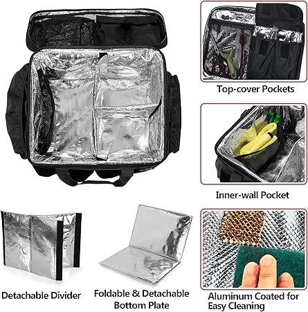 - [ Grill Caddy ] With aluminum coated and lid, the main compartment is easy to wipe and keep the interior clean. Detachable divider separates the inside into 3 parts. Top-cover pockets, front pockets, side pockets, back pockets and loops add a lot of extra space