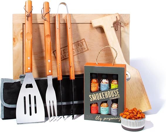 - EVERYTHING BUT THE POOFY, WHITE HAT. Featuring a spatula, tongs, fork and tool tote bag. Plus, Smokehouse BBQ Rubs and hardwood grill scraper with a bottle opener.