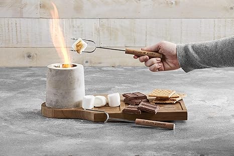 - 4-piece set. Wooden board holds s’more ingredients, two metal and wood skewers and concrete mini fire pit.