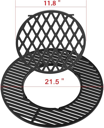 - Comes with 2 parts: the hole cooking grate is 21.5″ in diameter , the inner sear grate is 11.8″ in diameter